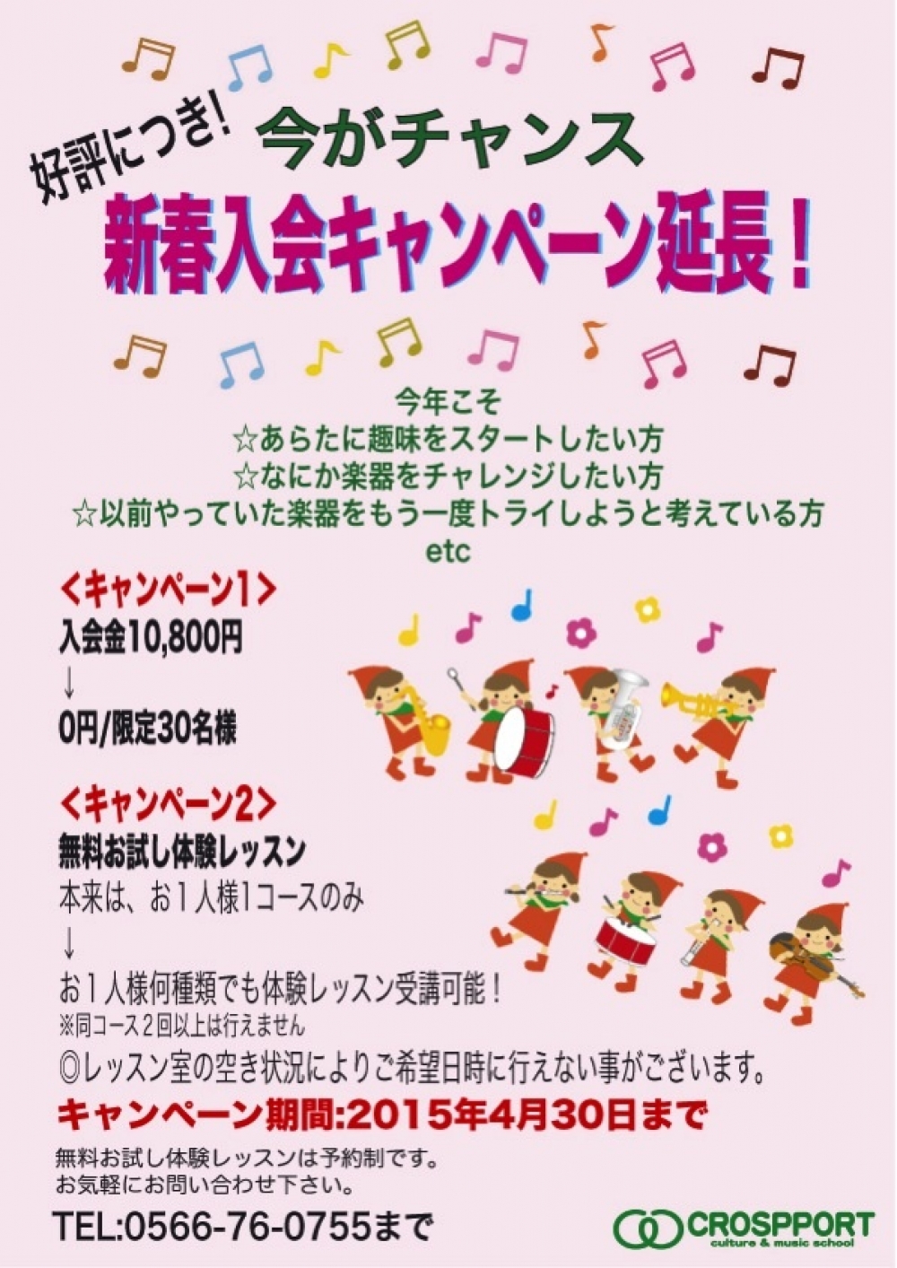 今がビックチャンス!!!今年こそ☆あらたに趣味をスタートしたい方☆なにか楽器をチャレンジしたい方☆以前やっていた楽器をもう一度トライしようと考えている方etc<キャンペーン1>入会金10,800円↓0円!!!限定30名様<キャンペーン2>無料お試し体験レッスン本来は、お1人様1コースのみ↓お1人様何種類でも体験レッスン受講可能!※同コース2回以上は行えませんこんな方へ例:ギターもやりたいしダンスも興味があるしなぁ、、、って悩み中の方。この機会にご遠慮なく受講下さい。◎レッスン室の空き状況により、ご希望日時に行えない事がございます。無料お試し体験レッスンは予約制です。お気軽にお問い合わせ下さい。