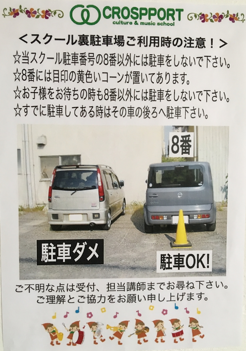 ③レッスンが終わるまで、お子様をお待ちの時も8番以外には駐車しないようにして下さい。