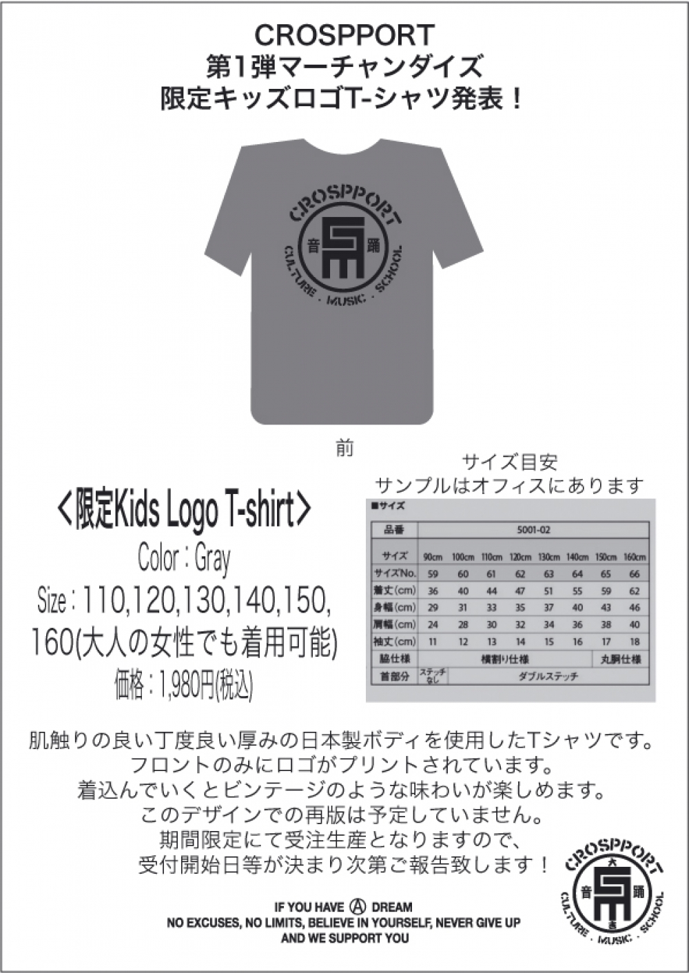 オリジナル限定キッズロゴT-シャツ発表!2018/09/13 記念のクロスポートオリジナルキッズT-シャツ第一弾! 110〜160まで豊富なサイズをご用意致しました。 オフィスに全サイズのサンプルが展示してますので、 実際のサイズ感をご確認下さい。 ご質問等、お気軽にお尋ね下さい! ご質問がありました! Q:Tシャツ、ステッカー、缶バッチに記載されている英語の意味はなんですか? A: NO EXCUSES, わかりやすいニュアンスで。 「もし君に夢があるなら 言い訳をするな、限界なんてないんだ、自分を信じろ、絶対諦めるな 上記の「NO EXCUSES, クサッですが参考までに、よろしくお願い致します! |