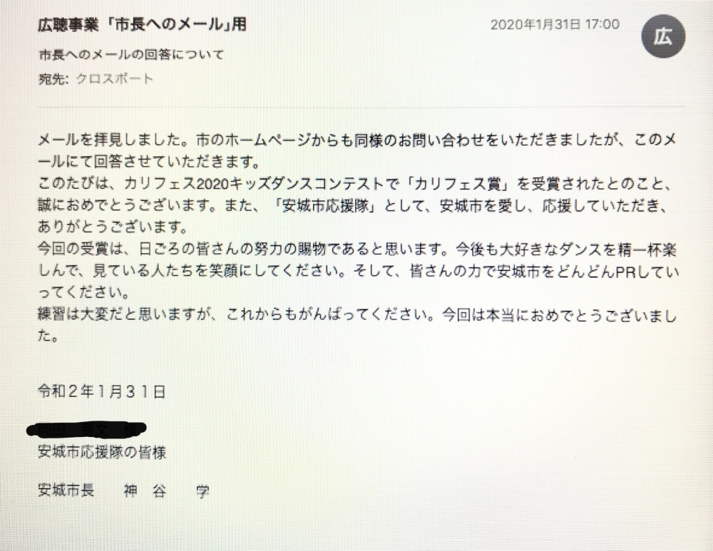 安城市長からお祝いメッセージをいただきましたぁ!2020/02/06 クロスポートキッズダンスコースの「安城市応援隊」にビッグネームからお祝いのお言葉をいただきました。