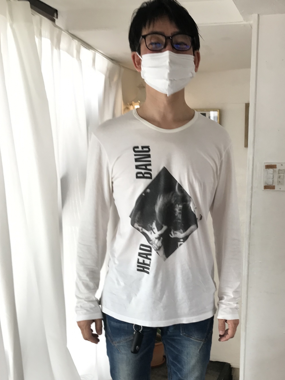 「HEAD BANG」と音楽のビートに合わせて頭を激しく上下に振るバンドマンがプリントされたカッコイイロンTを着てました♬