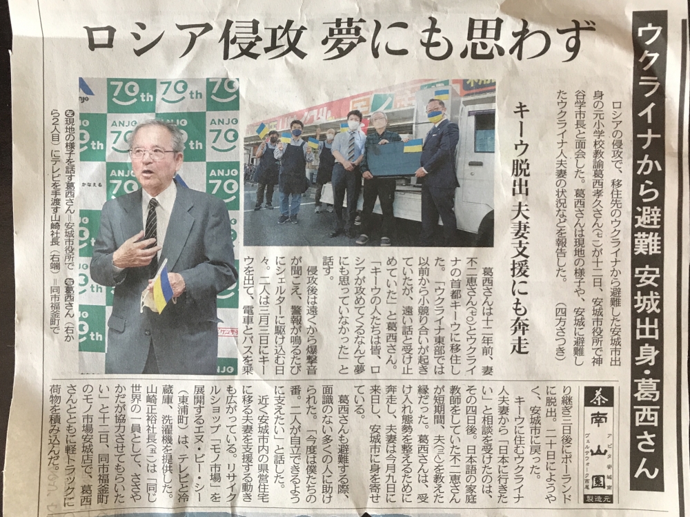 今日4/13(水)の朝刊にウクライナから避難された安城市の葛西さんご夫婦の記事が掲載されていました。