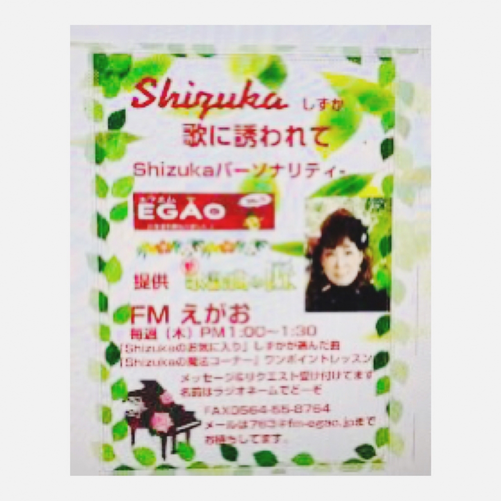 <番組の詳細> エフエムEGAO(76.3MHz) 放送:毎週木曜日13:00スタート*生放送 タイトル:『Shizuka歌に誘われて』 パーソナリティー:Shizuka エフエムEGAOホームページ:http://fm-egao.jp
