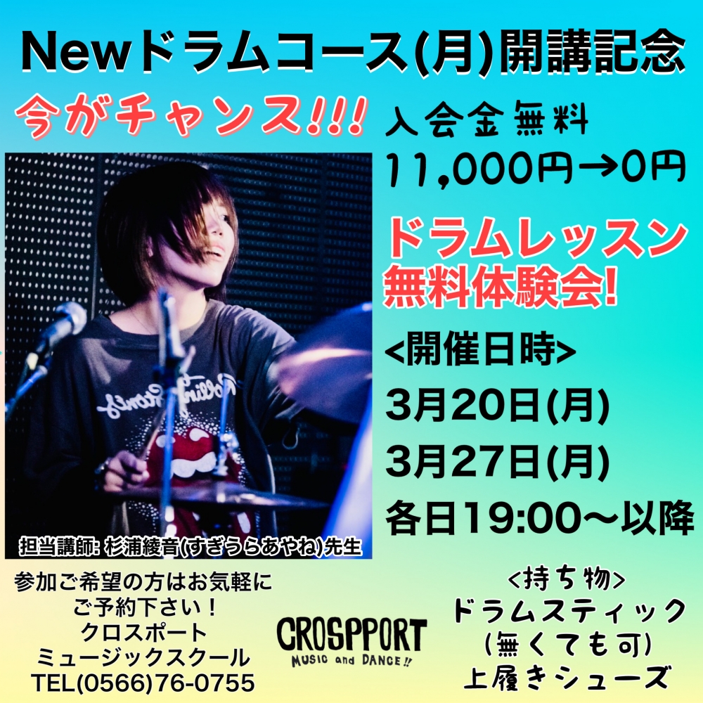Newドラムコース(月)開講記念入会金無料キャンペーン!