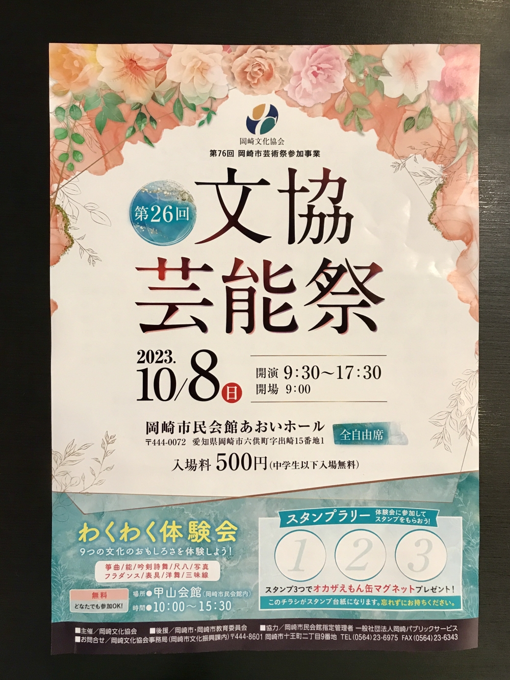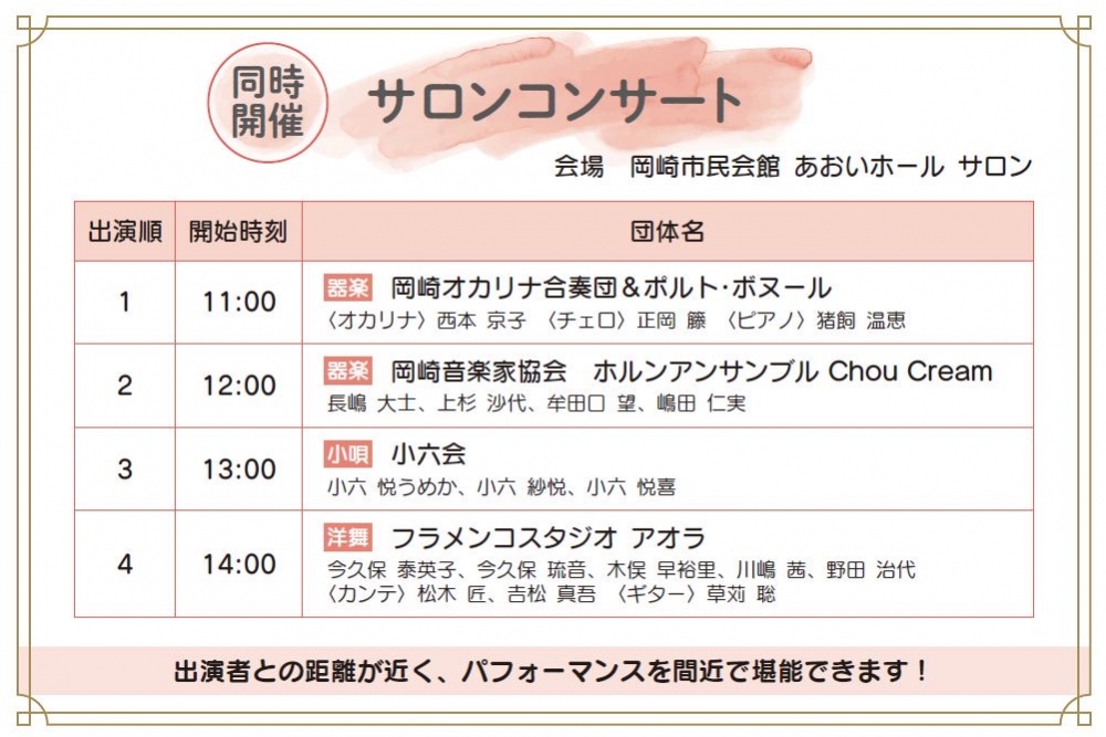 文協芸能祭は、あおいホールでの公演、サロンコンサート、わくわく体験会の3つのプログラムで構成された、楽しみが盛りだくさんの芸能の祭典のようです。
