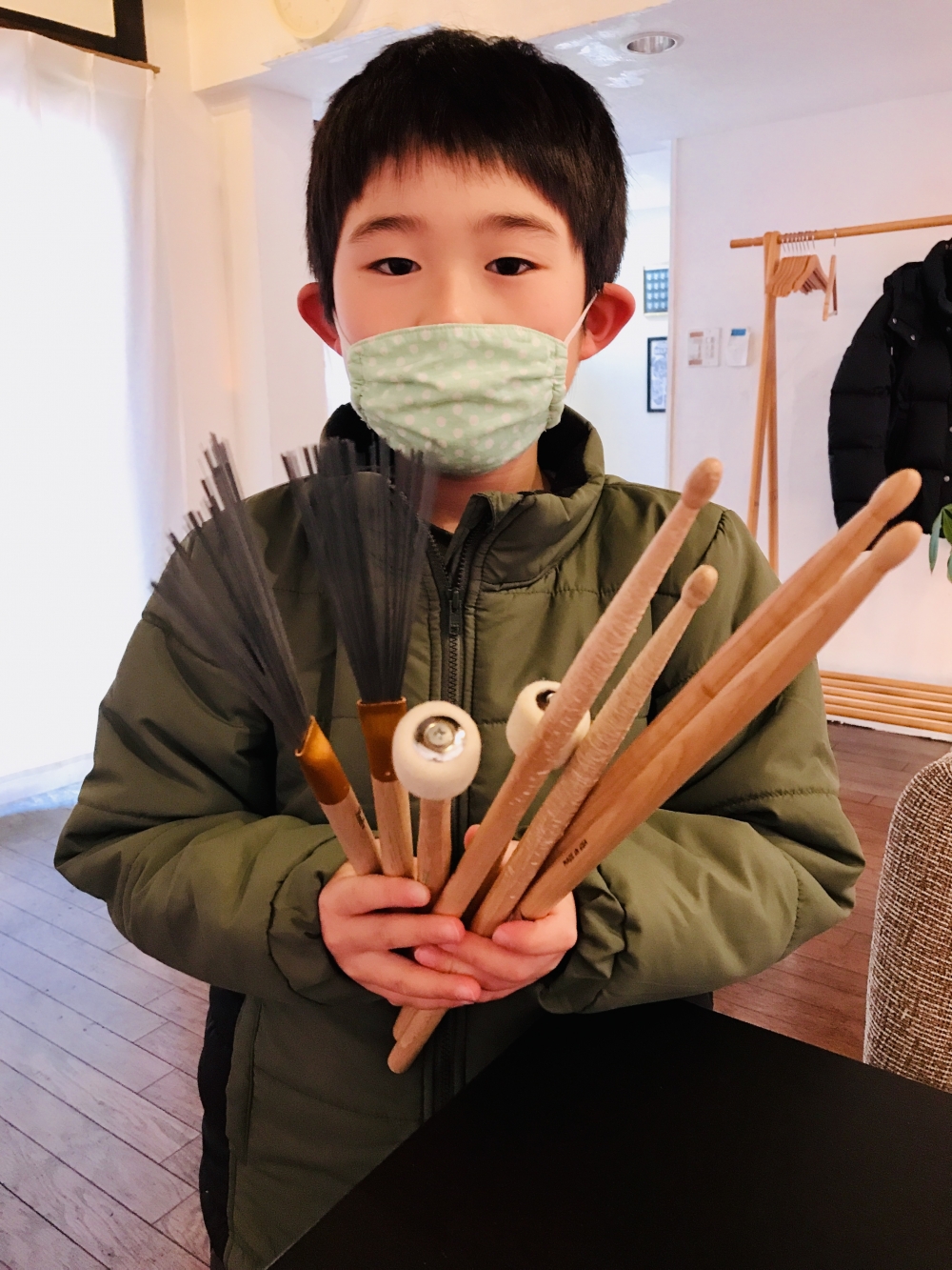 ブラシのようなスティックの実演をしてくれながら使い方を楽しそうに教えてくれました、本当にドラムが好きなんだと関心!