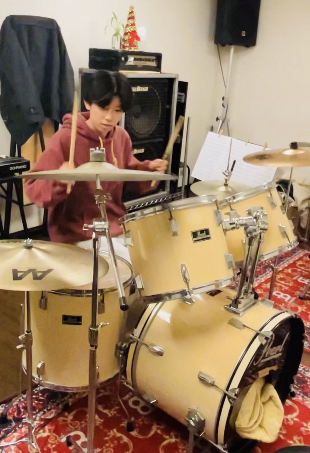お母様と一緒にグループレッスンを受講している学生の生徒さん。初心者からスタートし、まだ1年未満とは思えないほどのパワフルなドラミングを披露してくれました。